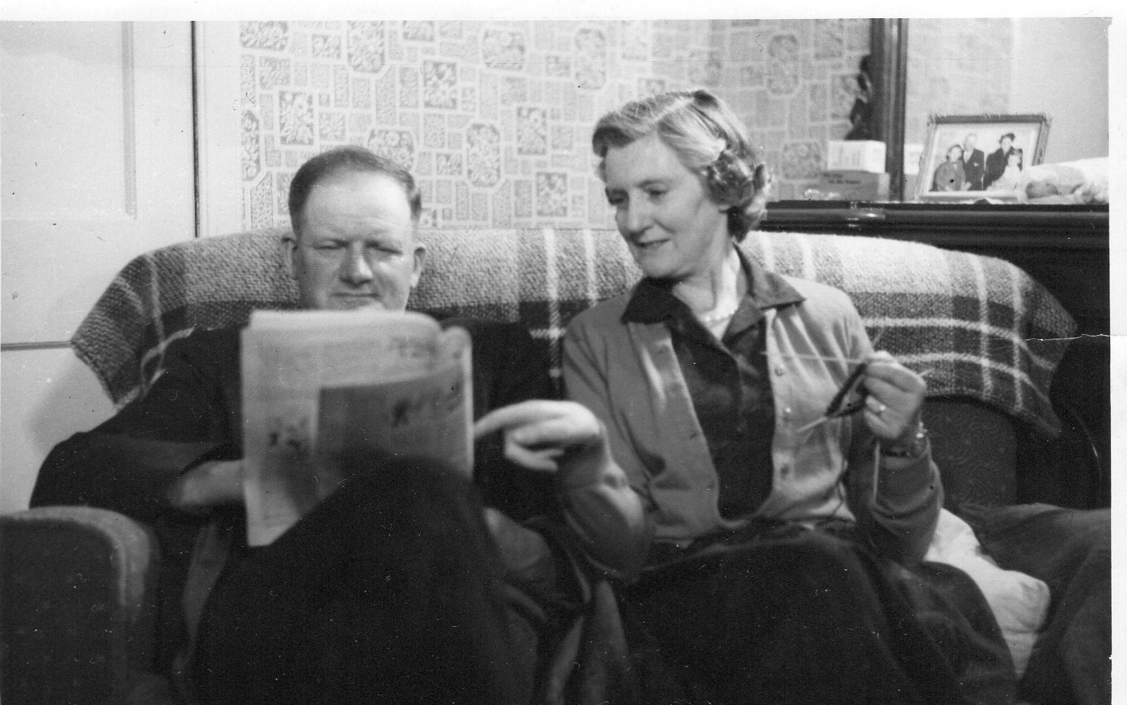 This photo must have been taken in the 50s in their living room. I don't know who took it. From about the age of 8, I spent about 2 weeks every summer at Nutberry. Those were wonderful holidays for me, a town girl, but who has always loved country life and animals. The Irvings were so good to me I wouldn't have missed a summer holiday in Kirkpatrick for worlds! Mrs. Irving and the Boss, those are the names we used for them, treated me like family, and I loved them dearly. At that time Willis Mclellan was working there and I had great fun with her too. Of course I kept in touch with them, visiting them in Canonbie after they retired from farming, and was happy that my two children loved to visit them there too and gobble up the delicious scones and apple tarts that Mrs. Irving was still making.
