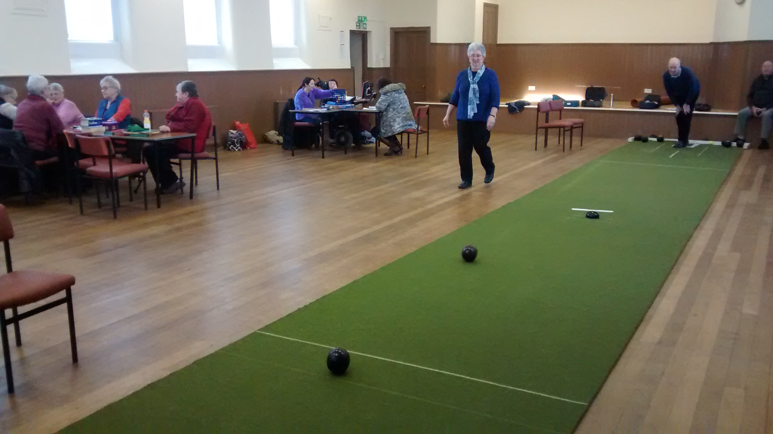 The social afternoon takes place in the Victoria Hall on Mondays throughout the year from 1 to 3pm. Crafts and games of peoples choice are enjoyed, plus a blether! In the photo, scrabble, the game 'Connect 4' and bowling are taking place.